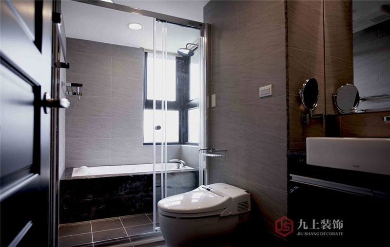 衛(wèi)生間設(shè)計得功能性強(qiáng),且簡潔,灰色系盡顯現(xiàn)代線條感