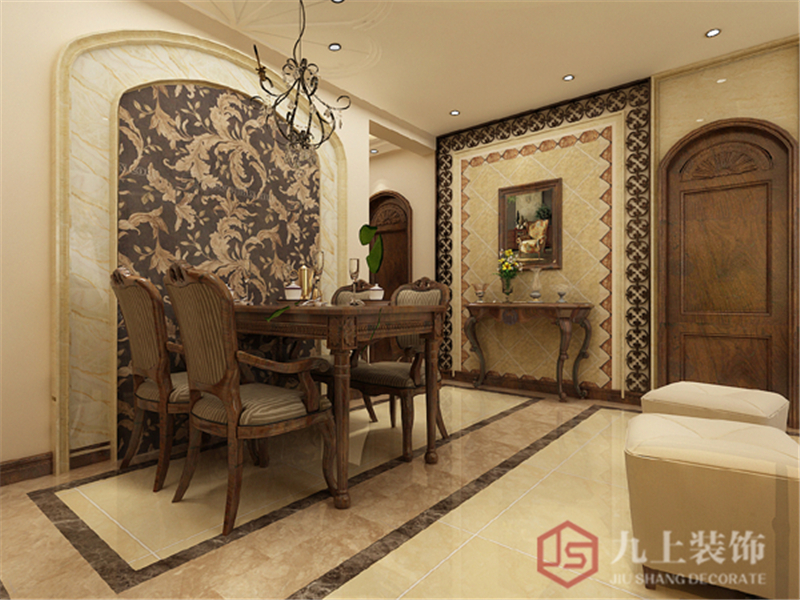 美式的花式線條對應餐廳背景墻的花紋,并加入植物點綴,表現出自然,圓潤的貴族氣息。