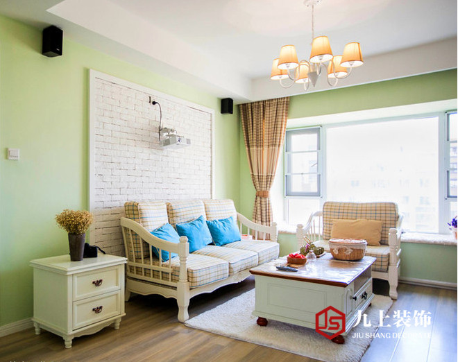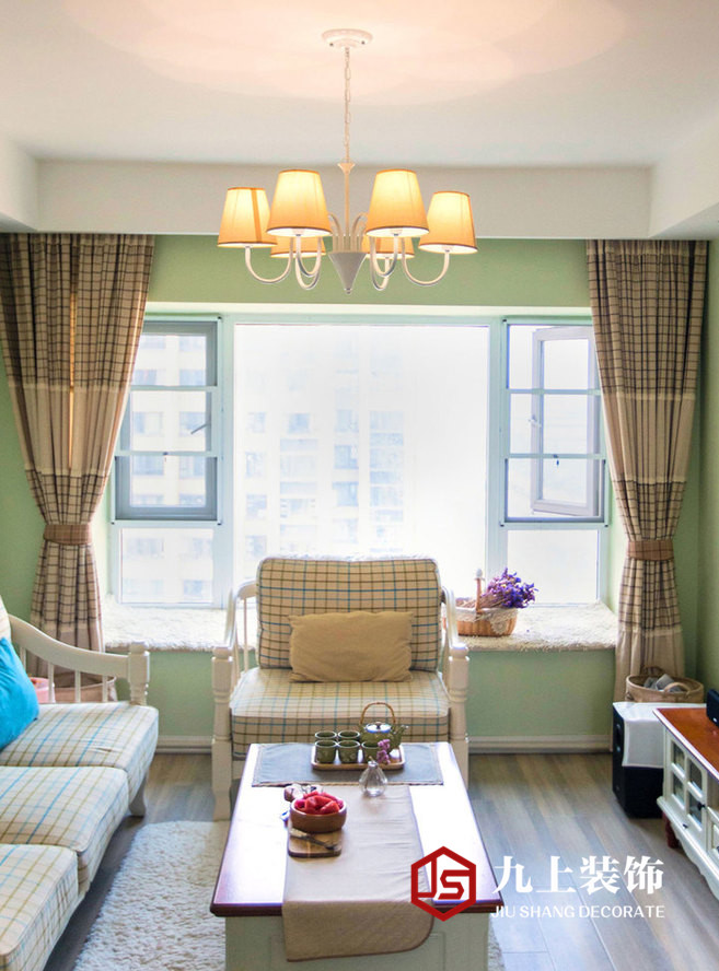 英式格子的窗簾和布藝沙發的搭配白色楸木田園茶幾,讓田園風格的自然氣息中多了一份對精致生活的追求。