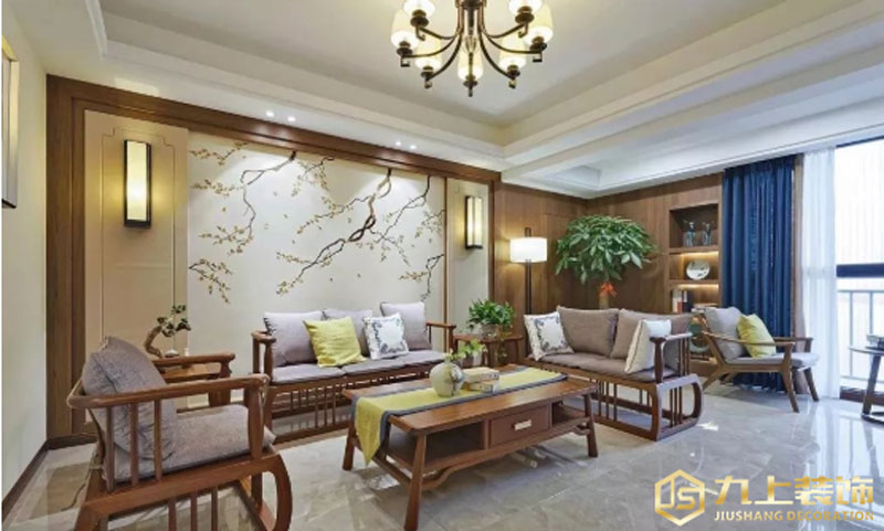 客廳在家具的搭配上,色調會比傳統中式風格稍淺,即使是藍和黃的配色,也都選擇了飽和度較低的風格,使整個空間不至于太過沉悶。