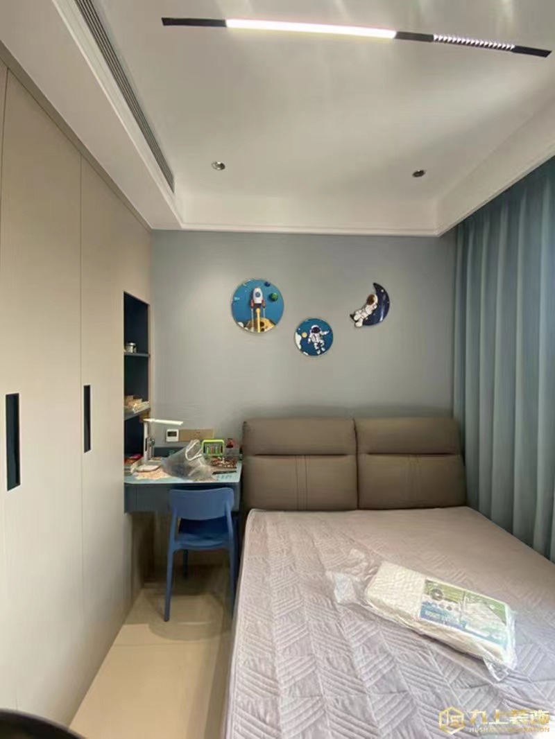 男孩房,整個房間以藍色為主,一排衣柜搭配連體書桌.