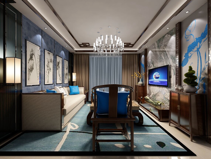 客廳效果圖最具代表性的裝飾主要體現在電視背景墻的造型處理上,主要運用了中式風格中的傳統角花和中式花格裝飾。