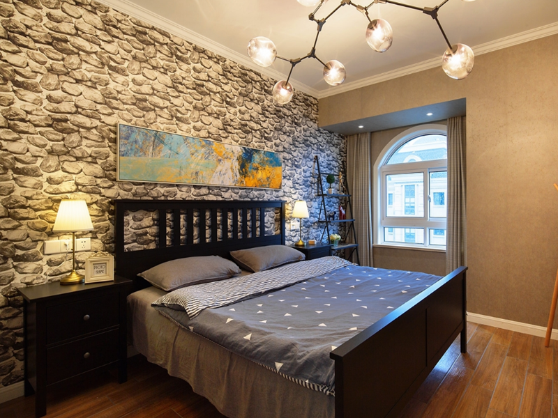 臥室設計的也很有藝術感,鵝卵石壁紙給這個臥室帶來一絲清涼......