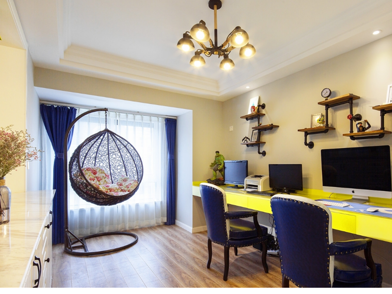 書房也是開放式的,在客廳一角,獨立成一個空間,懶人沙發的設置,讓這個空間辦公、休閑一體化。