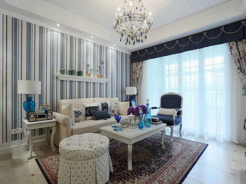 藍白色條紋相間的壁紙,把電視背景墻鋪陳出有立體感的空間。