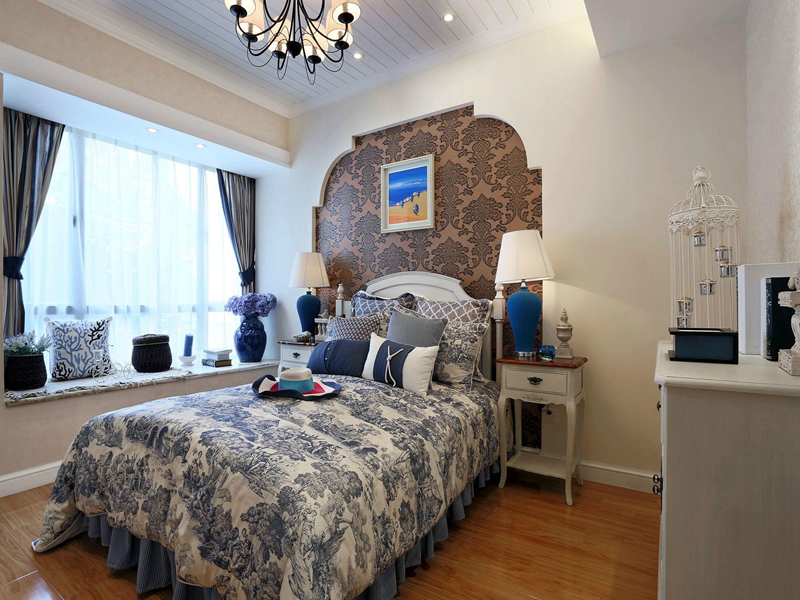 主臥給人的感覺是柔和、干凈的,色調(diào)淺淺,氛圍溫馨。床頭設(shè)計了裝飾性的弧形窗,藍天白云,得到了視覺上的滿足。