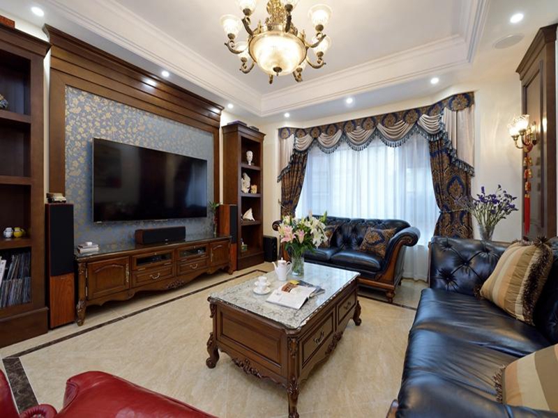 現代美式風格,追求華麗、高雅的古典風格。居室色彩主調為白色。家具為古典彎腿式,家具、門、窗漆成白色。擅用各種花飾、豐富的木線變化、富麗的窗簾帷幄是西式傳統室內裝飾的固定模式,空間環境多表現出華美、富麗、浪漫的氣氛。