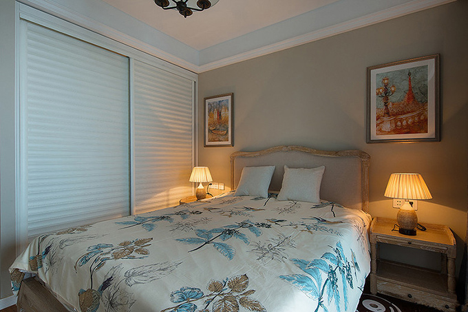 條紋色白推拉門壁櫥衣柜增大空間面積,淺色木制地板與木質柜子、床融為一體突顯空間典雅,墻面油畫配上花式床上用品增加空間色彩。