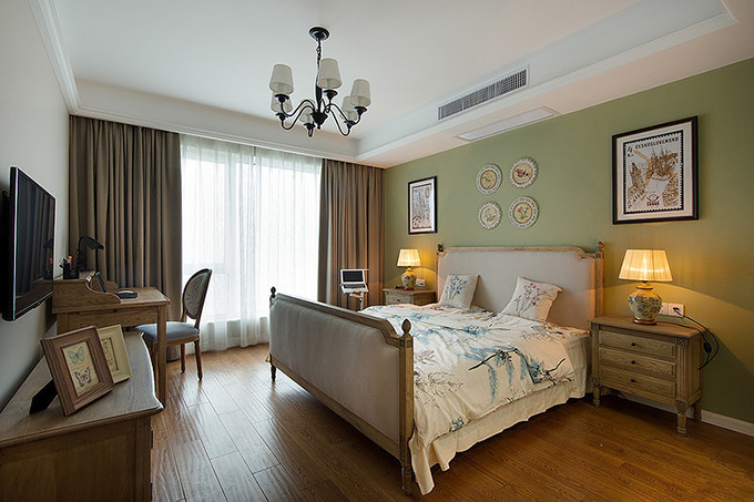 雙層的吊頂配上拱形鐵柱罩式吊燈突顯空間舒適大氣,吊墜布與電視機背景墻面互相對應配上舊式木制家具體現室內溫馨舒適。
