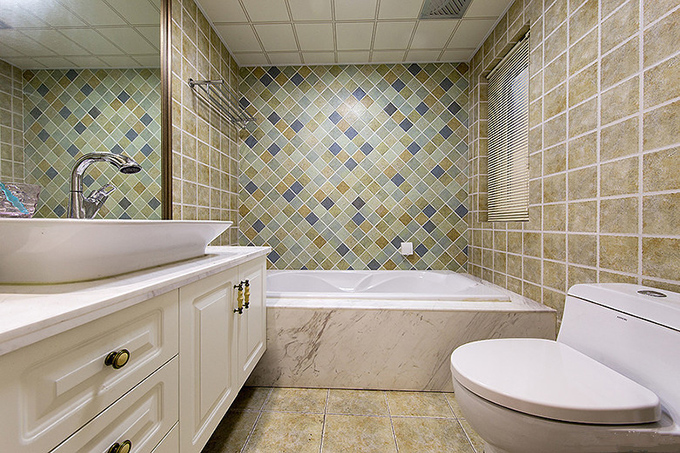開放式的衛生間,乳白色和白色的用品突出空間清新典雅,淡色花式地磚配搭黃色小方塊壁磚體現出樸素氣息,真面多色壁磚增加室內色彩。