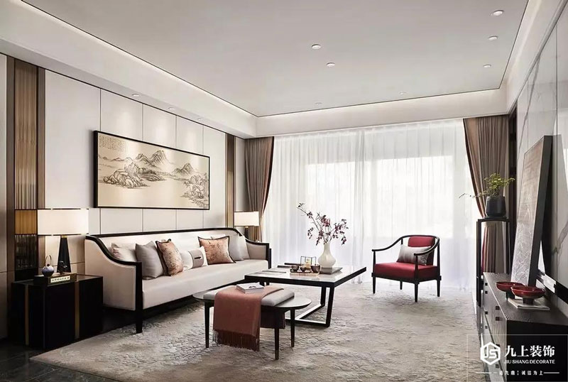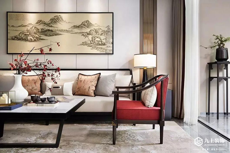 沙發墻在硬包背景墻的基礎,掛上一幅江山景色的裝飾畫,布置禪意優雅的沙發、茶幾與休閑椅,布置意韻十足的花瓶插花、茶具等細節裝飾,帶來一個詩意穩重的端莊與高檔感。