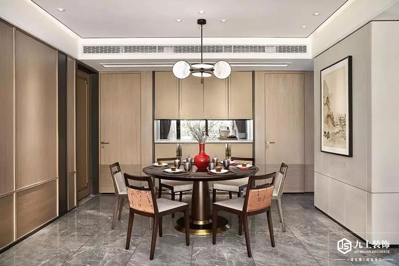 餐廳在深灰色的地面磚基礎,布置以圓形的餐桌椅組合,在東方禪意范的餐具、花瓶、墻面裝飾畫的裝飾點綴,也讓空間顯得更加端莊優雅而高級。