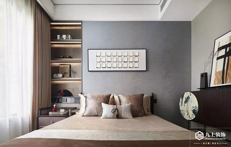 次臥的床頭墻是灰色的墻布空間,中間掛上一幅文藝范的橫幅裝飾畫,左側還加入了一個開放的展示格架,層板架也是加入了燈帶的烘托,布置出一個自然舒適的文藝與端莊氣質。