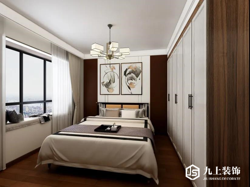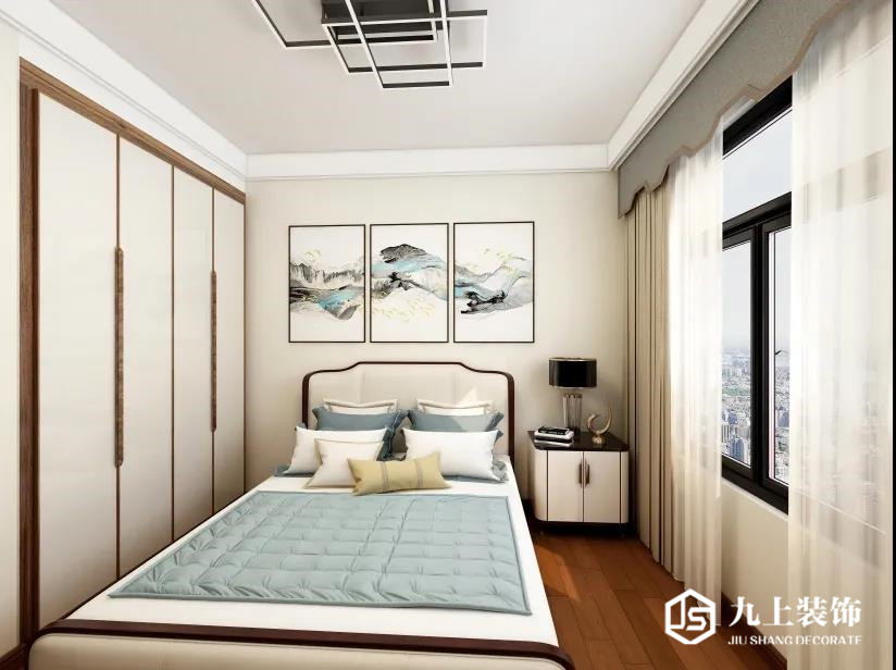 電視背景墻、沙發(fā)背景裝飾畫(huà)古色古香,再搭配新中式家具,吊燈,整體格調(diào)富有韻味。