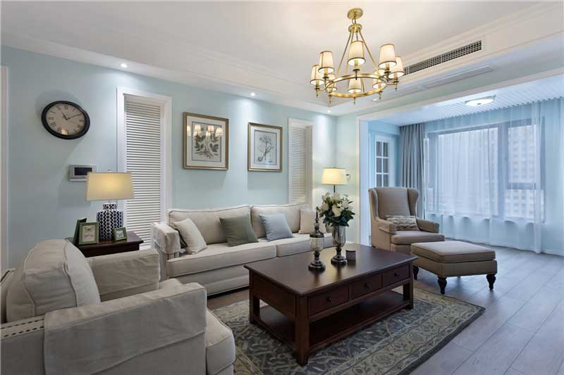 經典的美式布藝沙發,造型簡約顏色優雅,原木做舊的茶幾,清新的淺藍色窗簾,沙發墻做了簡單的假窗裝飾效果,簡約中充滿了鄉村風的情懷,照片墻的點綴,然干這個墻面不顯的單調。