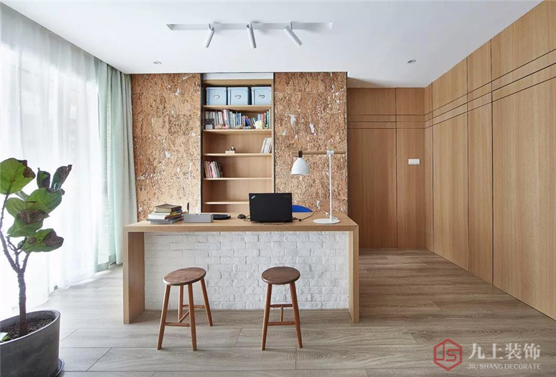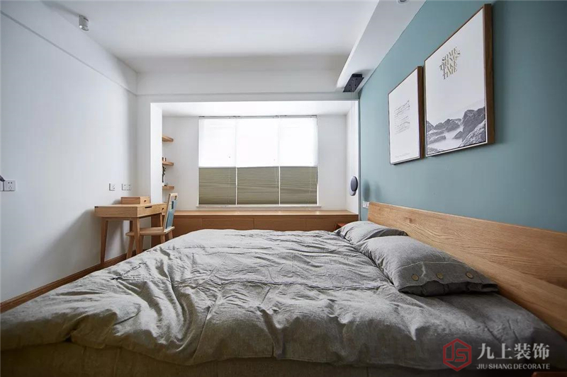 藍色背景墻簡潔大方,搭配原木配置,整體風格舒適簡潔
