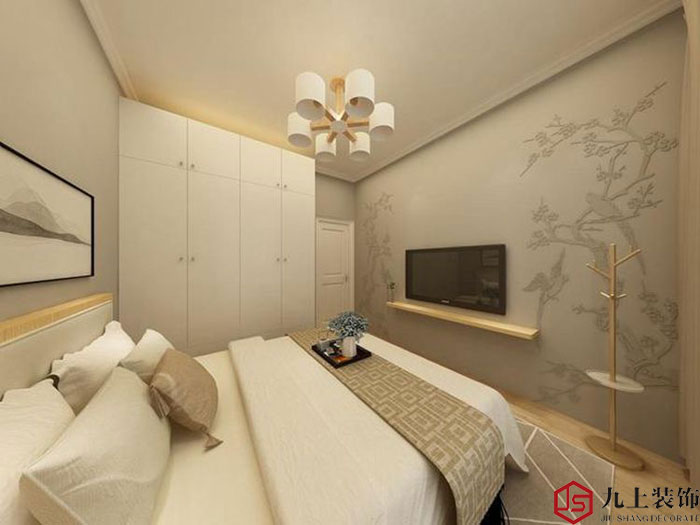 臥室這樣裝顯得質感十足,墻壁上采用了時下很流行的高級灰色,還打造了一面文藝范十足的電視背景墻,使得臥室看上去非常大氣時尚,另外實木的地板上還采用了這種灰色的地毯,大大提升了臥室的舒適度。