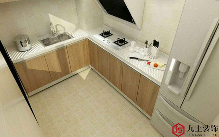廚房的面積不大,整體布局非常棒,以后我家裝修也要這么裝修,櫥柜呈L型擺放將廚房的空間充分的利用了起來,能夠提供比較好的儲物空間,將冰箱很好的鑲嵌在墻角,櫥柜采用原木色的面板搭配灰色的大理石臺面,顯得非常精致漂亮。