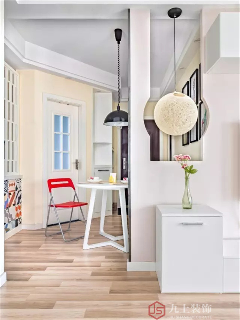 進(jìn)門過道切了廚房的一個角,擴大之后變成了小餐廳,隔斷造型和月球燈完美配合