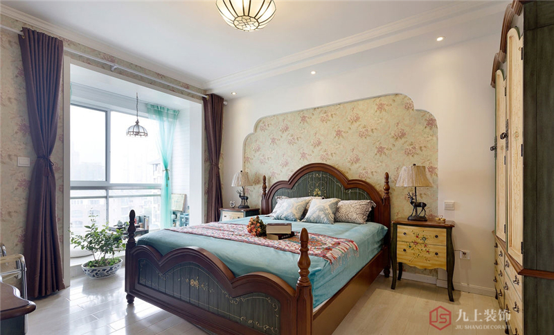 木床兩頭以及床頭柜點綴的花紋圖案增添了鄉村田園氣息。