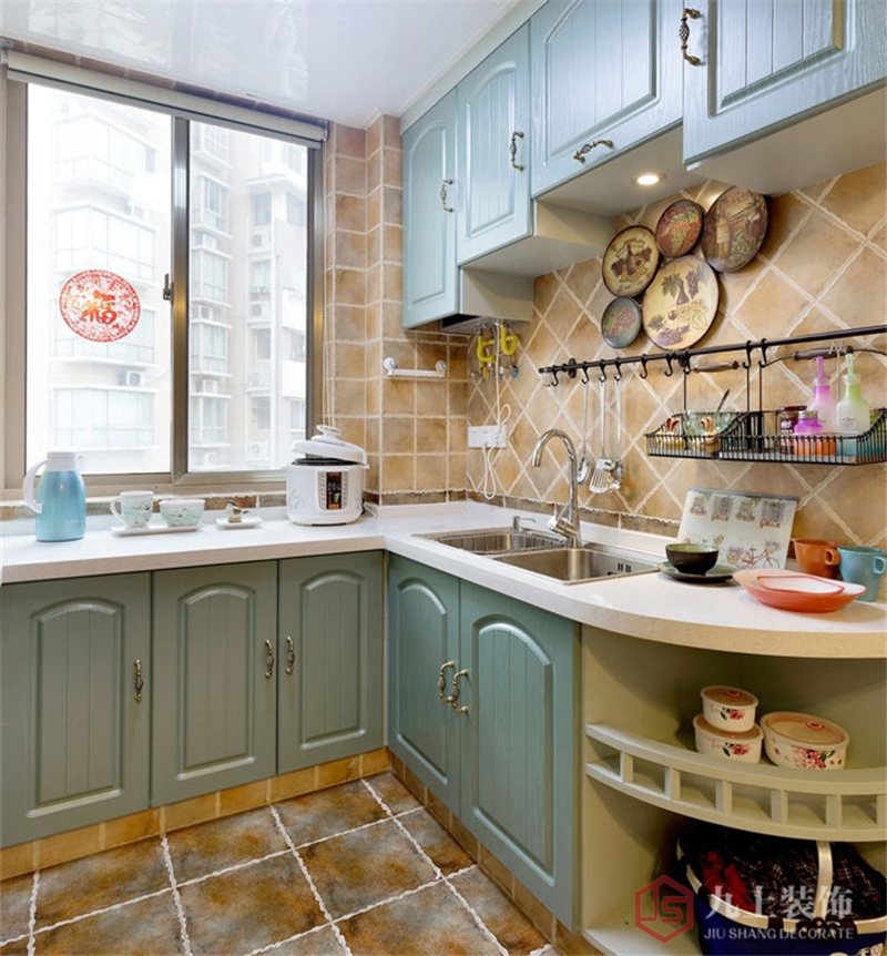 石紋地磚,淡黃墻磚,淺藍櫥柜,白色臺面,色彩搭配相得益彰。