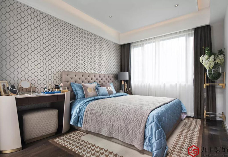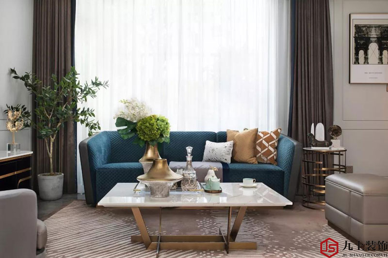 客廳,創時空將對于家的期待轉譯成設計的語匯,選用素白色的極簡法式背景墻、水波紋理石飾面來定義空間的清雅柔和,雅致的霧霾藍與格紋輕輕地挑起空間的韻律美感,搭配純白花藝,空間附著著一層恰到好處、不過于濃郁的浪漫情調。陽光透散過微透的紗簾為空間染上一抹暖意,令人們不覺沉溺于韶華中的閑適與安緩。