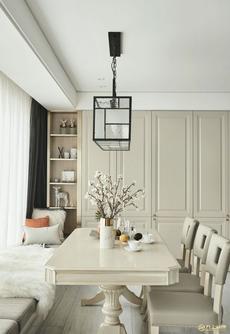 鉚釘皮質餐椅顏值高,舒適與質感兼具。飄窗是用餐的卡座與是休閑的好地方。