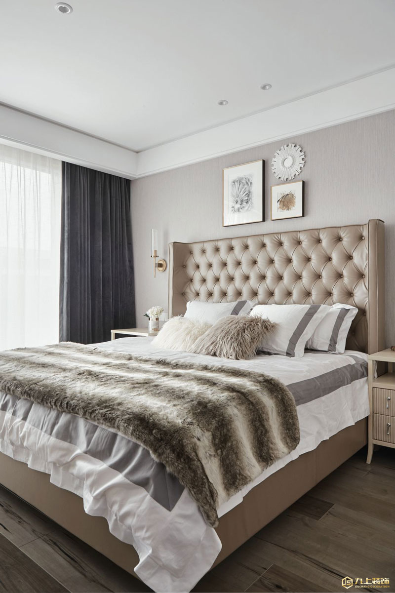 臥室延續了整體設計風格,淡雅的配色和精致的壁燈、裝飾畫,不經意間流露細膩獨特的設計心思,同時也展現優雅柔和的氣